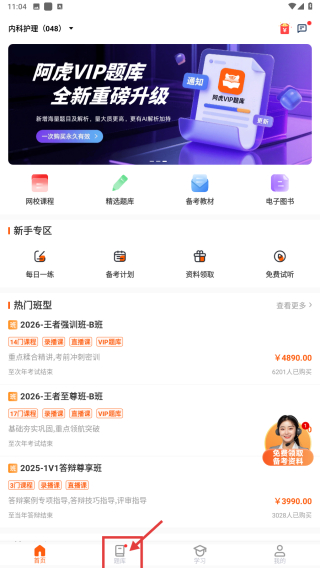 1、打開阿虎醫(yī)考類應(yīng)用,點擊底部題庫選項,進入題庫頁面。