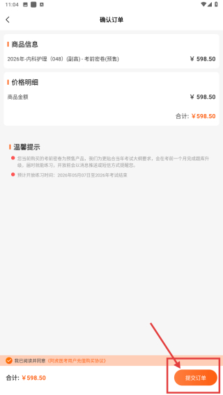 4、在確認訂單頁,點擊提交訂單按鈕,完成考前密卷的購買操作。