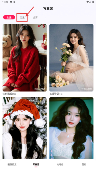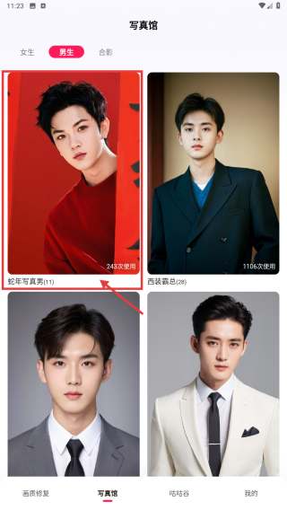 2、在寫真館頁面,點(diǎn)擊男生分類標(biāo)簽,篩選男生寫真模板。