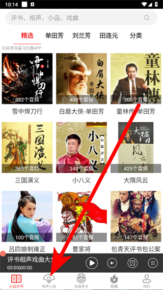 1、打開相聲評書戲曲大全,點擊頁面底部的相聲小品選項。