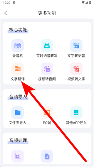 3、在更多功能頁面,點(diǎn)擊文字翻譯選項(xiàng)進(jìn)入翻譯頁面。