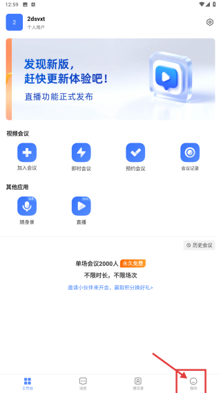 1、打開視頻會議類應(yīng)用,點(diǎn)擊底部我的選項(xiàng),進(jìn)入個人中心頁面。