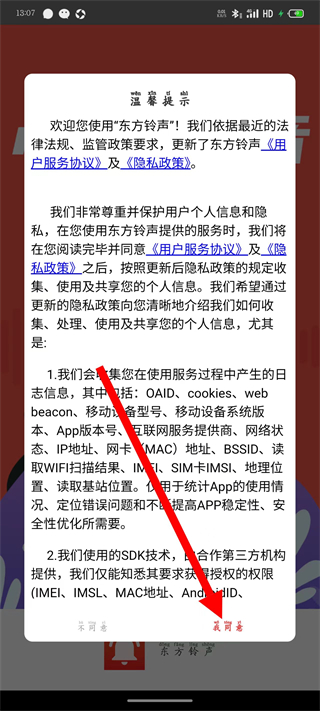 1、打開東方鈴聲,在彈出的溫馨提示彈窗里點(diǎn)擊我同意。