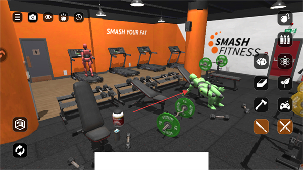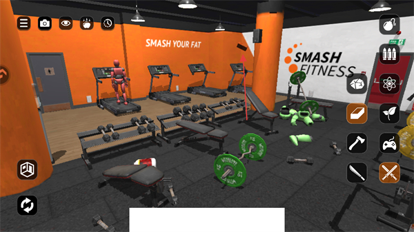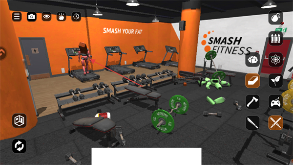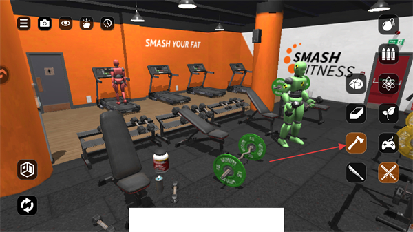1、進(jìn)入游戲,看到健身房場景,右側(cè)有工具圖標(biāo),點(diǎn)擊工具圖標(biāo)準(zhǔn)備對(duì)場景內(nèi)物體進(jìn)行操作。