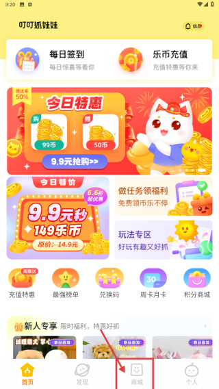 1、打開(kāi)叮當(dāng)抓娃娃類(lèi)應(yīng)用,點(diǎn)擊底部商城選項(xiàng),進(jìn)入商城板塊。