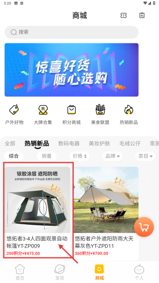 3、在熱銷(xiāo)新品商品列表中,選擇悠拓者3-4人四面觀景自動(dòng)帳篷YT-ZP009商品,點(diǎn)擊進(jìn)入詳情頁(yè)。