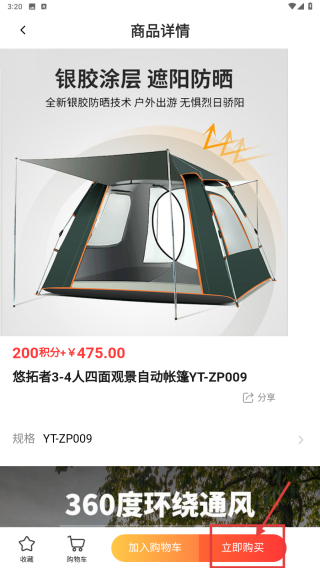 4、在商品詳情頁(yè),點(diǎn)擊立即購(gòu)買(mǎi)按鈕,進(jìn)行該帳篷的購(gòu)買(mǎi)操作。