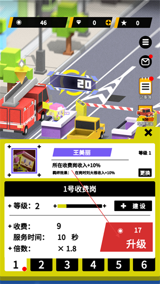 2、點擊界面上的收費崗,查看員工王美麗信息,花費資源點擊升級來提升收費崗屬性。