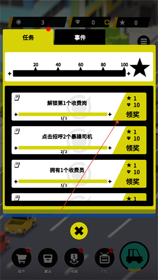 3、點擊屏幕下方任務(wù)按鈕,查看任務(wù)列表,如解鎖第1個收費崗等,完成后點擊領(lǐng)獎獲取獎勵。