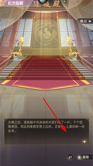 1、推進(jìn)劇情發(fā)展,點(diǎn)擊劇情界面的推進(jìn)按鈕,閱讀建極殿相關(guān)的劇情內(nèi)容,了解背景故事和角色設(shè)定,推進(jìn)劇情。