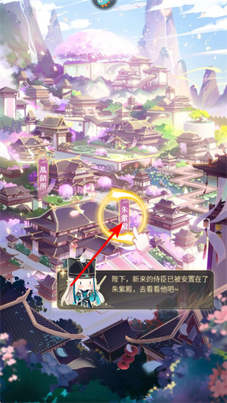 3、前往宮殿區(qū)域,點(diǎn)擊朱紫殿標(biāo)識(shí),前往該宮殿區(qū)域,開展與新臣安置、宮廷事務(wù)相關(guān)的任務(wù),推進(jìn)宮廷管理進(jìn)程。