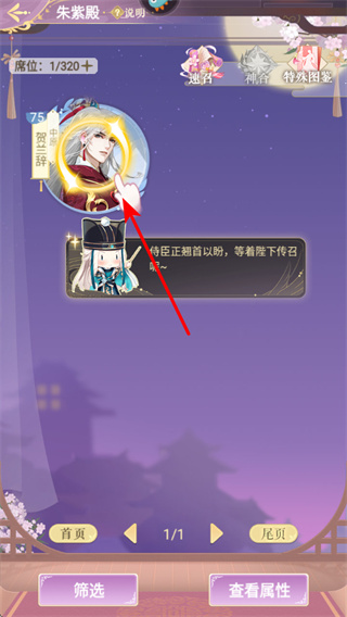 4、召見宮廷角色,在朱紫殿界面中,點(diǎn)擊賀蘭辭的角色圖標(biāo),召見該角色,進(jìn)行對(duì)話、分配任務(wù)或查看其屬性。