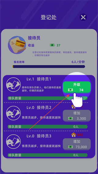 2、在登記處界面,點(diǎn)擊升級(jí)按鈕,消耗一定資源升級(jí)接待員,提升接待效率和收益。