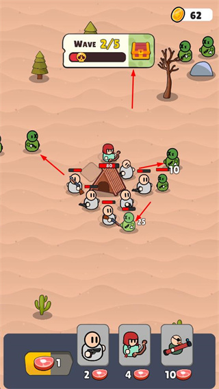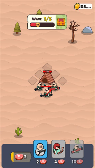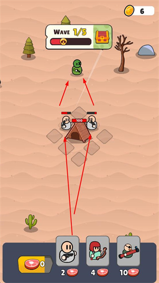 1、在沙漠場景中,部署角色防御帳篷,抵御綠色怪物進(jìn)攻。