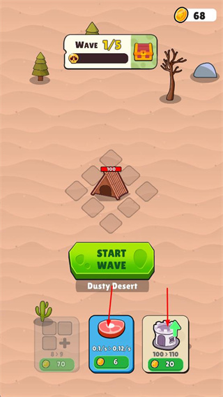 3、點擊START WAVE開啟新波次挑戰(zhàn),同時可消耗金幣提升資源產(chǎn)出。