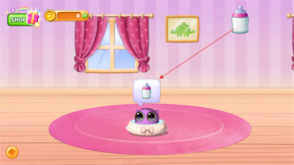 3、當(dāng)寵物頭上出現(xiàn)奶瓶圖標(biāo)時(shí),點(diǎn)擊右側(cè)奶瓶道具,給寵物喂食。