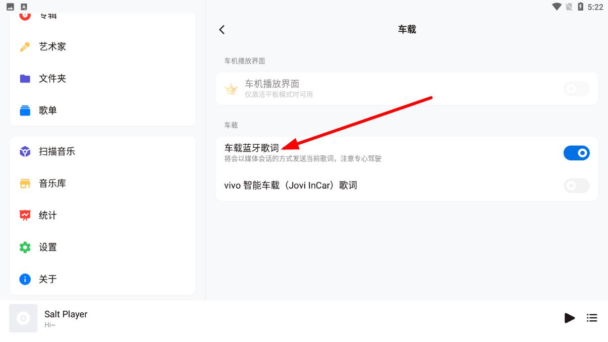3、在車載設(shè)置頁面,可對(duì)車載藍(lán)牙歌詞等選項(xiàng)進(jìn)行設(shè)置。