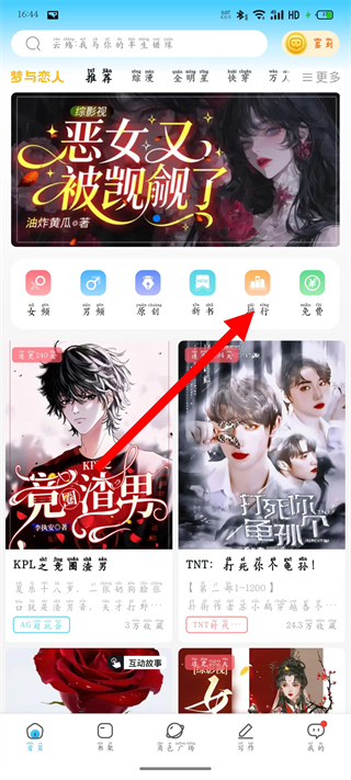 1、打開話本小說,進(jìn)入首頁,點(diǎn)擊排行選項(xiàng)。