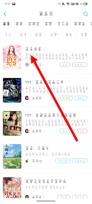 2、進(jìn)入排行頁面,能看到各類榜單及對(duì)應(yīng)的小說作品,挑選一部感興趣的小說并點(diǎn)擊。