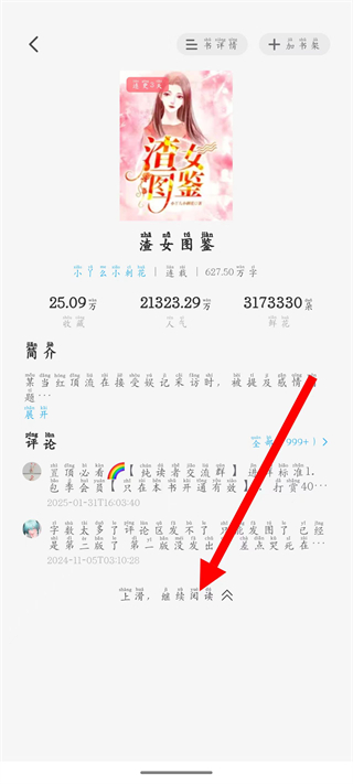 3、進(jìn)入小說詳情頁,查看小說簡(jiǎn)介等信息,點(diǎn)擊開始繼續(xù)閱讀按鈕,進(jìn)入小說閱讀界面。
