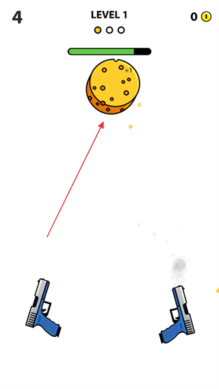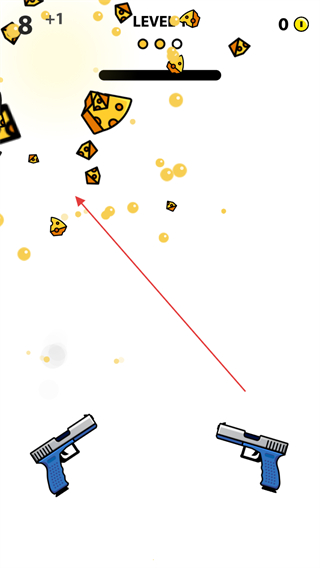 1、進入游戲,查看屏幕上方顯示的關(guān)卡信息LEVEL1和剩余子彈數(shù),點擊屏幕開槍射擊上方目標物,如奶酪。