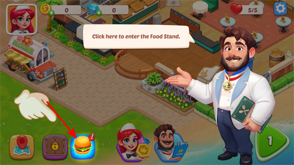 1、進入美食攤位,點擊漢堡圖標,進入Food Stand美食攤位界面,開始經(jīng)營美食制作業(yè)務。