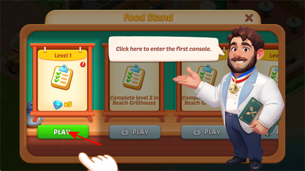 2、開始關卡挑戰(zhàn),在Food Stand界面中點擊PLAY按鈕,進入第一關的美食制作關卡,開啟挑戰(zhàn)。