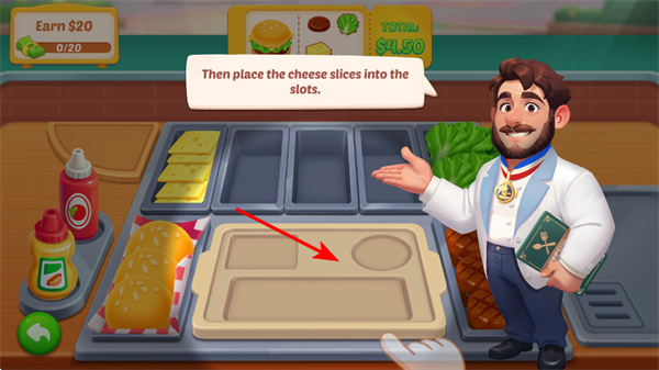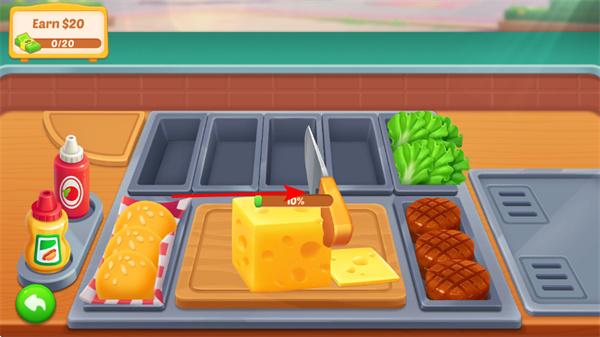 3、制作食材準備,使用刀具切割奶酪,完成食材的預處理步驟,為后續(xù)的漢堡制作準備原料。