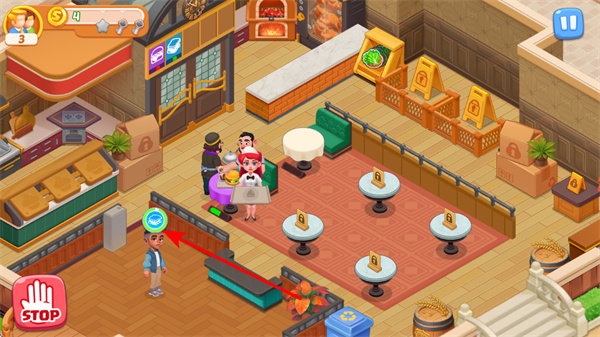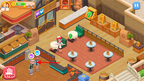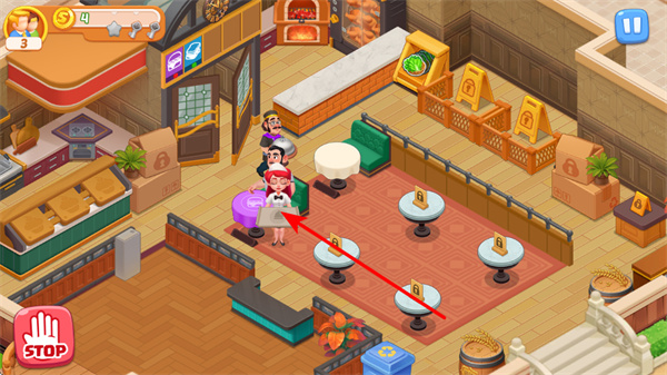 3、迎接新到顧客,留意門口的新顧客,點擊其頭上的標(biāo)識,引導(dǎo)其進入餐廳,增加客流量,提升收益。
