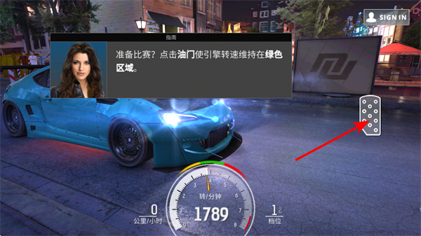 2、控制油門操作,通過右側(cè)的油門按鈕,控制賽車的油門,使引擎轉(zhuǎn)速維持在綠色區(qū)域,為起步準(zhǔn)備。