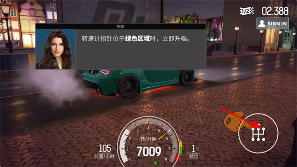 3、執(zhí)行換擋操作,當(dāng)轉(zhuǎn)速指針位于綠色區(qū)域時,點擊換擋按鈕,及時升檔,提升賽車的速度,保持競速優(yōu)勢。