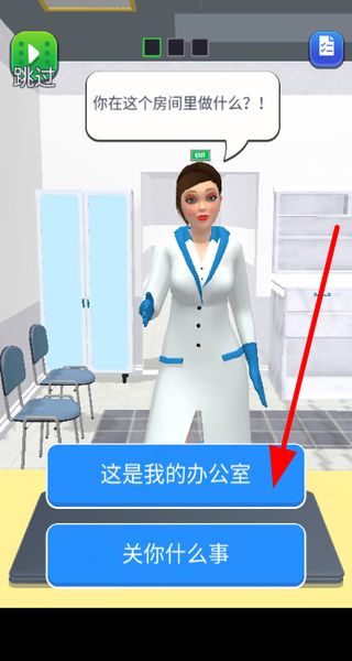 1、面對人物詢問,從這是我的辦公室和關(guān)你什么事中選合適選項回應(yīng),推動劇情發(fā)展,開啟后續(xù)操作。