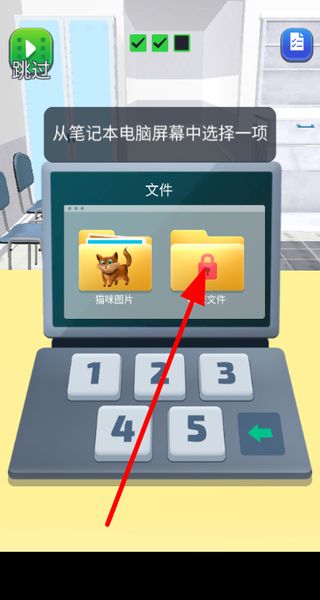 3、解鎖電腦后,從筆記本電腦屏幕里的貓咪圖片和帶鎖文件中選一項,不同選擇會帶來不同的游戲走向。