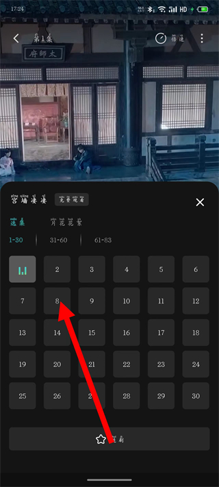 3、進(jìn)入短劇播放頁(yè)后,點(diǎn)擊劇集選擇界面里的集數(shù),切換集數(shù)。