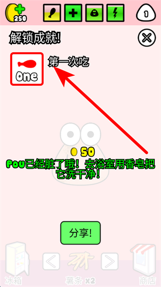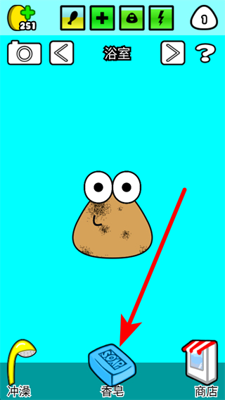 2、清潔方面,進(jìn)入浴室場(chǎng)景,點(diǎn)擊香皂,能給臟臟的Pou涂上香皂泡沫,之后用沖澡功能沖掉泡沫,完成清潔也可獲得獎(jiǎng)勵(lì)。