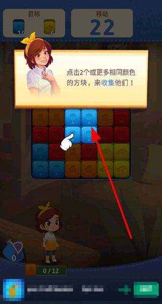 3、進(jìn)入消除環(huán)節(jié),點(diǎn)擊2個(gè)或更多相同顏色的方塊,就能收集它們,這是獲取道具的關(guān)鍵方式。