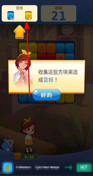 4、上方會(huì)顯示目標(biāo)方塊,收集足夠數(shù)量的目標(biāo)方塊就能達(dá)成目標(biāo),推動(dòng)游戲進(jìn)程。