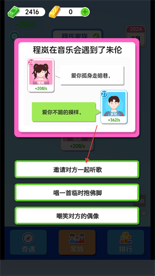 1、在游戲中遇到新人物觸發(fā)對話,如程嵐在音樂會遇到朱倫,點擊邀請對方一起聽歌來增進關(guān)系。