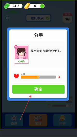 2、若選擇不當(dāng)行為導(dǎo)致分手,如出現(xiàn)分手提示,點擊確定確認關(guān)系結(jié)束,留意心情值變化。