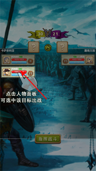 1、選擇出戰(zhàn)人物,點(diǎn)擊人物面板,選中目標(biāo)人物出戰(zhàn),組建戰(zhàn)斗隊(duì)伍,為即將到來(lái)的戰(zhàn)斗做好人員準(zhǔn)備。