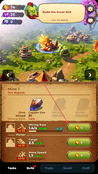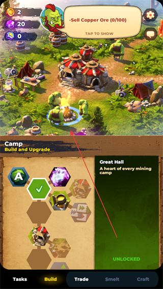 2、點擊下方Build選項,按照提示BuildtheGreatHall,解鎖并建造GreatHall建筑。