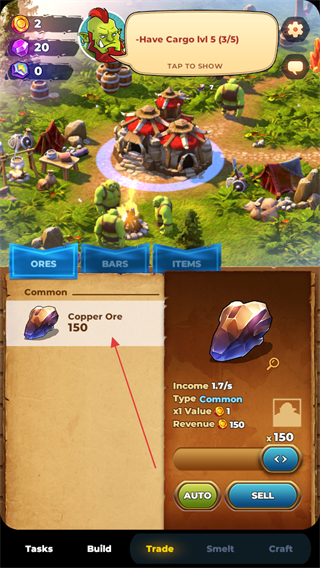 3、點擊Trade選項,在交易界面找到CopperOre,按要求完成SellCopperOre0/100的售賣任務(wù)。