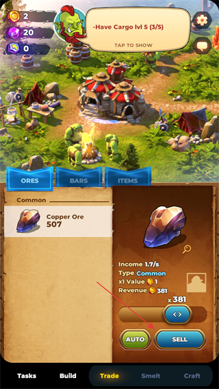 4、持續(xù)采礦積累資源,當CopperOre達到一定數(shù)量,可點擊SELL出售資源獲取收益,完成目標。