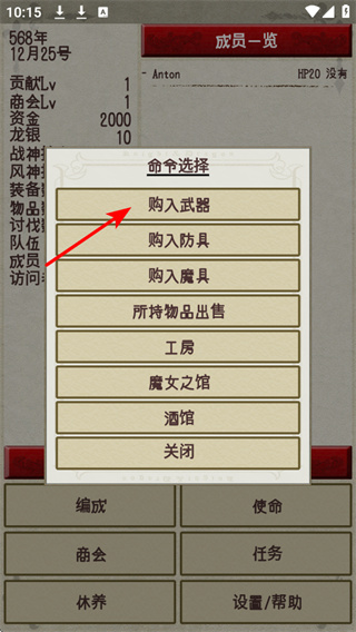 3、選擇采購(gòu)類型,在命令選擇界面中,點(diǎn)擊購(gòu)入武器選項(xiàng),進(jìn)入武器采購(gòu)界面,為成員配備合適的武器,提升其戰(zhàn)斗實(shí)力。