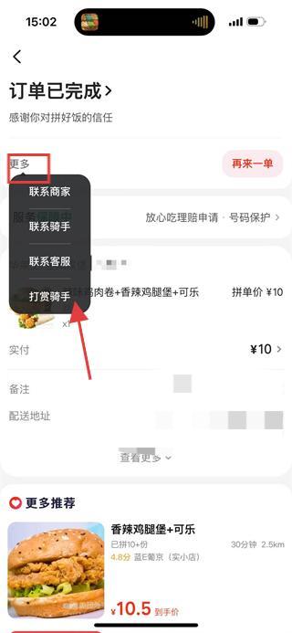 4、在訂單詳情頁面,點(diǎn)擊更多選擇打賞騎手,即可打賞騎手。