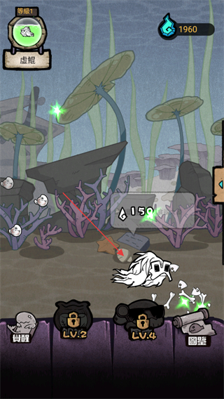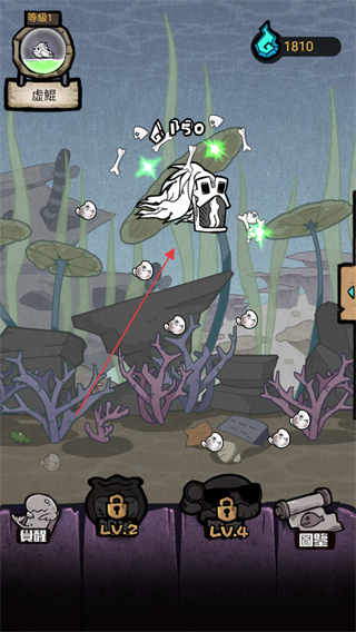 1、進入游戲,處于等級1,操控虛鯤點擊屏幕攻擊周圍白色小骷髏,獲取經(jīng)驗值和資源。