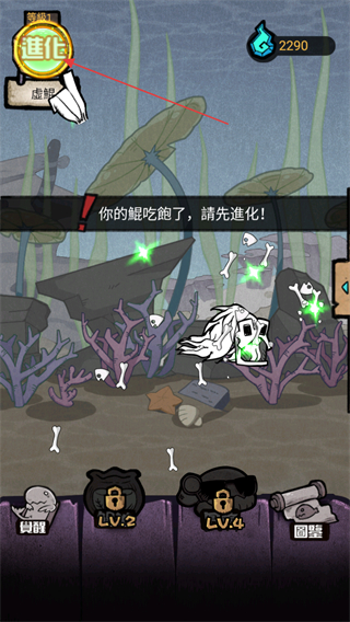3、當(dāng)虛鯤吃飽滿足進化條件,出現(xiàn)提示你的鯤吃飽了,請先進化!,暫停攻擊準(zhǔn)備進化。
