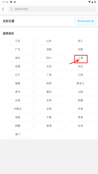 3、在城市選擇界面,點擊上海選項,添加上海市天氣信息。