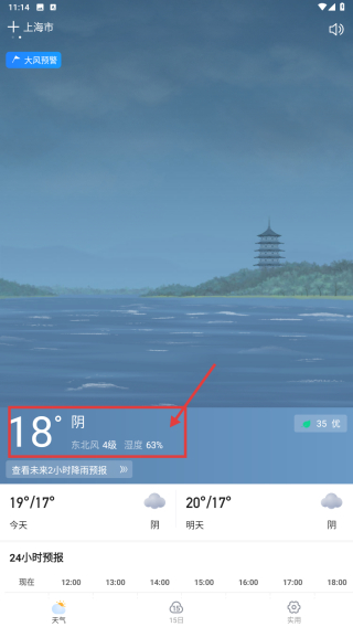 4、添加完成后,查看上海市的天氣信息,當前溫度為18°,天氣陰,東北風4級,濕度63%。