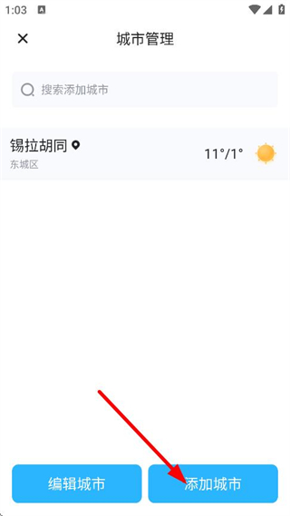 2、在城市管理頁面,點擊添加城市,進入城市選擇頁面。